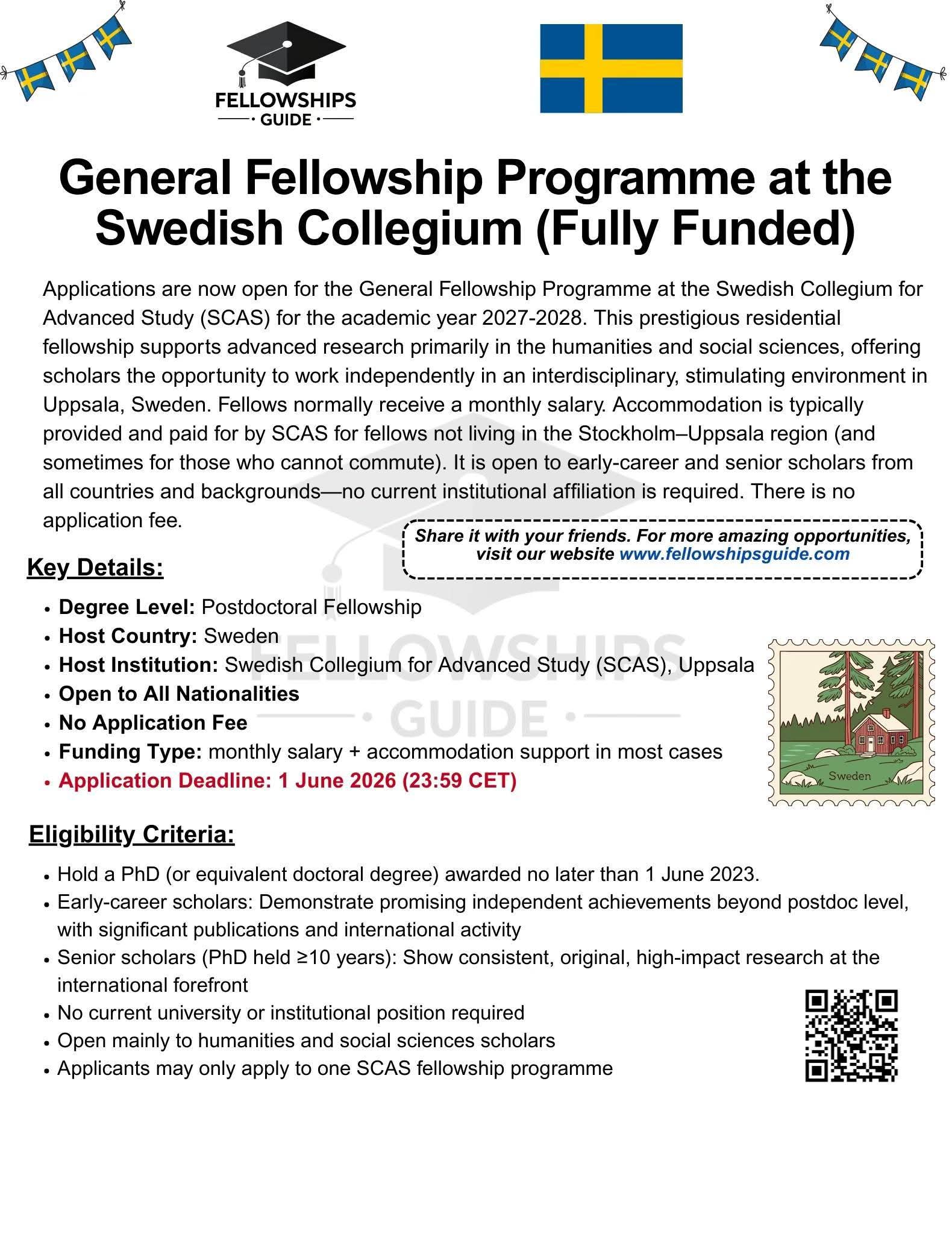 Monday, April 6, 2026The Swedish Collegium for Advanced Study (SCAS) is inviting applications for its fully supported residential fellowship in Uppsala, Sweden. β¨ Fellowship Highlights: π‘ Residential program with accommodation support π° Monthly stipend to cover living expenses π©βπ¬π¨βπ« Open to early-career and senior scholars (PhD completed β₯3 years) π Open to scholars of all nationalities; no institutional affiliation required π Application Deadline: 1 June 2026 (23:59 CET) π More details & application: Link