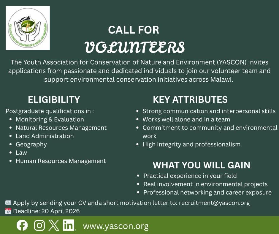 🌱 The Youth Association for Conservation of Nature and Environment (YASCON) is inviting applications from passionate and self-driven young people to join its mission of protecting and restoring the environment in Malawi. 🌍 About the Opportunity YASCON is a youth-led movement focused on environmental conservation, advocacy, education, and sustainable community action. Volunteers will contribute to impactful initiatives aimed at safeguarding nature for present and future generations. 🎓 Required Qualifications Applicants must hold a Master’s Degree in any of the following fields: Monitoring & Evaluation Natural Resources Management Land Administration Geography Law Human Resource Management 🎯 Who Should Apply? Passionate about environmental conservation Self-motivated and committed to community impact Ready to contribute skills to real-world sustainability efforts 📅 Application Deadline: 20 April 2026 🔗 Apply here: Link Join a growing network of young leaders working toward a sustainable and environmentally conscious future. 🌿