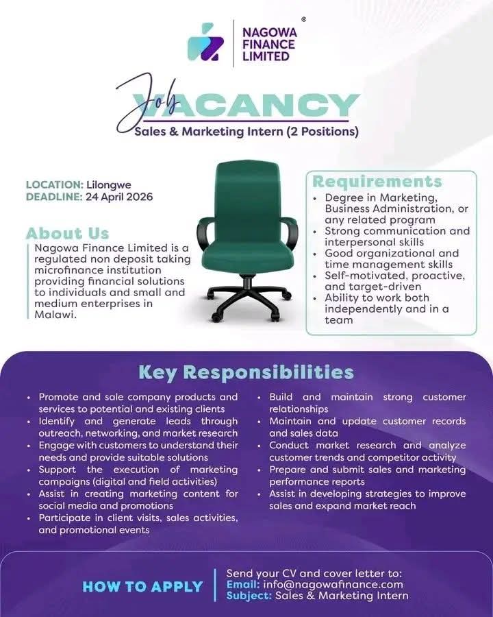 š¼ Position: Sales & Marketing Intern (2 Positions) š Location: Lilongwe š£ Internship | š¢ Entry-level Overview Join a growing microfinance institution and gain hands-on experience in sales, marketing, and customer engagement. Key Responsibilities āļø Promote and sell company products āļø Generate leads & engage clients āļø Support marketing campaigns (digital & field) āļø Create content for social media āļø Conduct market research & analyze trends āļø Maintain customer records & prepare reports Requirements āļø Degree in Marketing, Business, or related field āļø Strong communication & interpersonal skills āļø Organized, proactive & target-driven āļø Ability to work independently & in a team š© How to Apply Send CV + Cover Letter to: āļø info@nagowafinance.com š Subject: Sales & Marketing Intern šļø Deadline: 24 April 2026