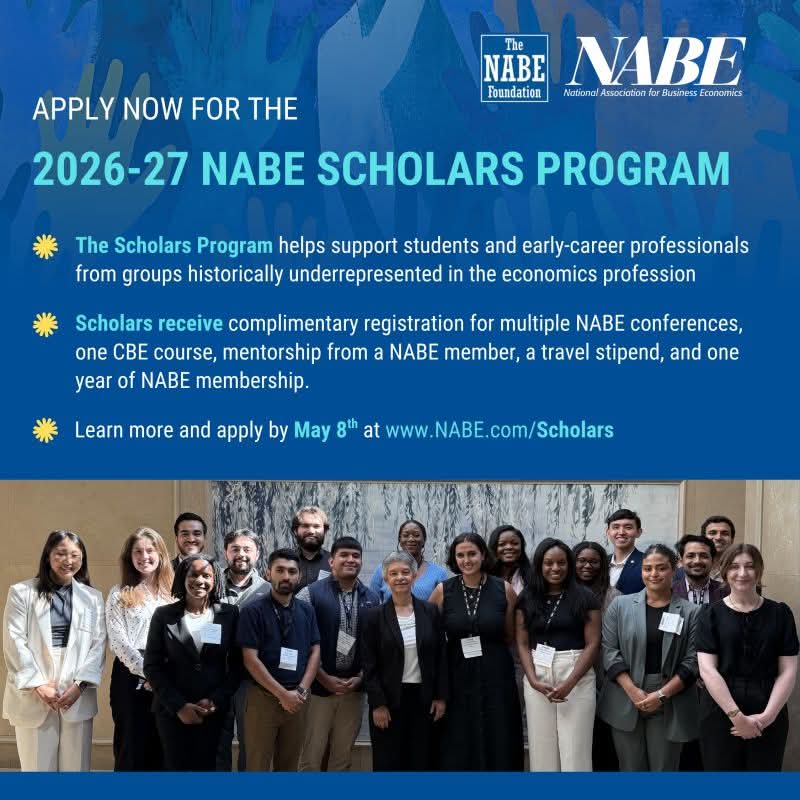 Tuesday, April 7, 2026Are you an aspiring economist looking to grow your career? The NABE Scholars Program is now accepting applications, offering valuable support for students and early-career professionals from underrepresented backgrounds. đŻ Program Benefits đ¤ Personalized mentorship from experienced economists đ¤ Access to leading conferences and industry events đ One-year complimentary NABE membership đ Free registration for the Certified Business Economist (CBE) course âď¸ Travel support of up to $400 for program events đ Opportunities to build a strong professional network đ Application Deadline: 8 May 2026 đ Apply here: Link