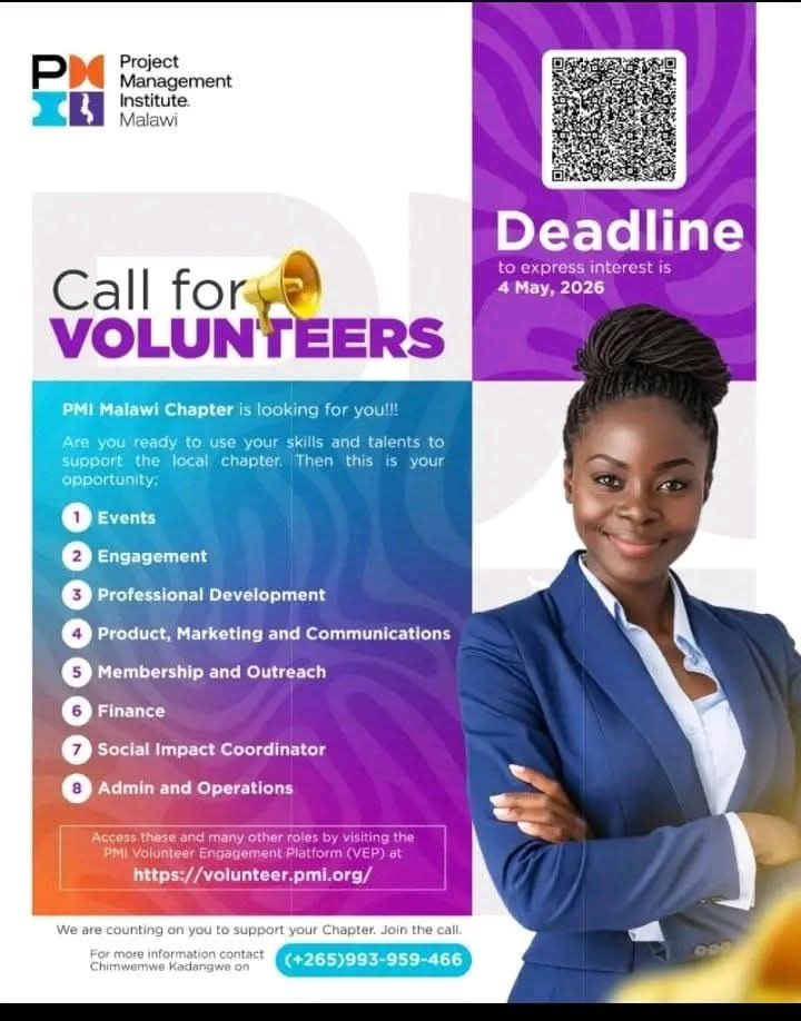The Project Management Institute (PMI) Malawi Chapter is inviting passionate individuals to join its volunteer team through the PMI Volunteer Engagement Platform (VEP): 🔗 Link This is a chance to contribute your skills, grow your network, and support professional development initiatives in Malawi’s project management community. 🧩 Available Volunteer Areas: Events Coordination Community Engagement Professional Development Marketing, Product & Communications Membership & Outreach Finance Support Social Impact Coordination Administration & Operations ⏳ Application Deadline: 4 May 2026 📞 Contact Person: Chimwemwe Kadangwe 📱 +265 993 959 466 If you’re interested in building experience, expanding your professional exposure, and contributing to impactful initiatives, this is a strong opportunity to consider.