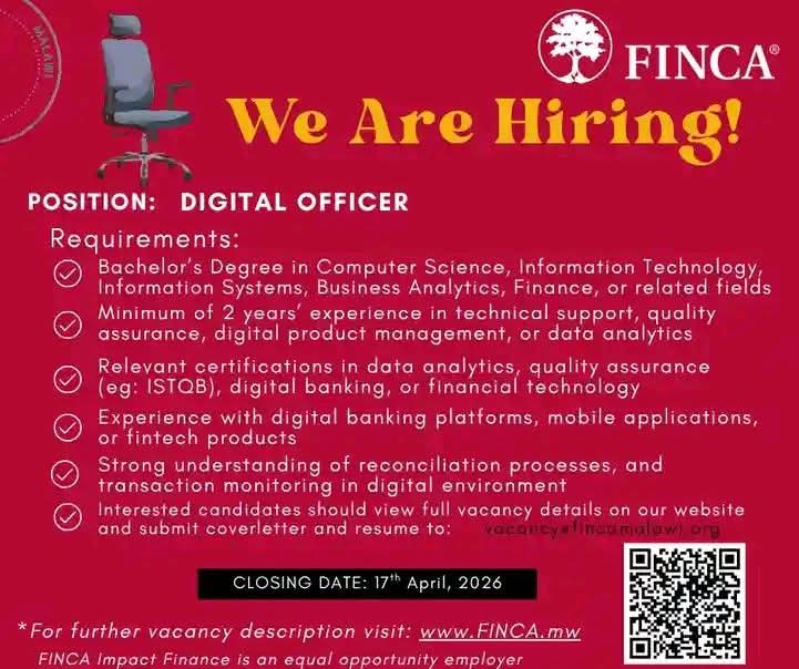 Tuesday, April 7, 2026FINCA Limited (Malawi) is seeking a qualified, dynamic, and professional Digital Officer to join the team at its Head Office in Blantyre. This is an exciting opportunity to contribute to digital initiatives in a leading financial institution. How to Apply Visit www.finca.mw� for full vacancy details or scan the QR code.