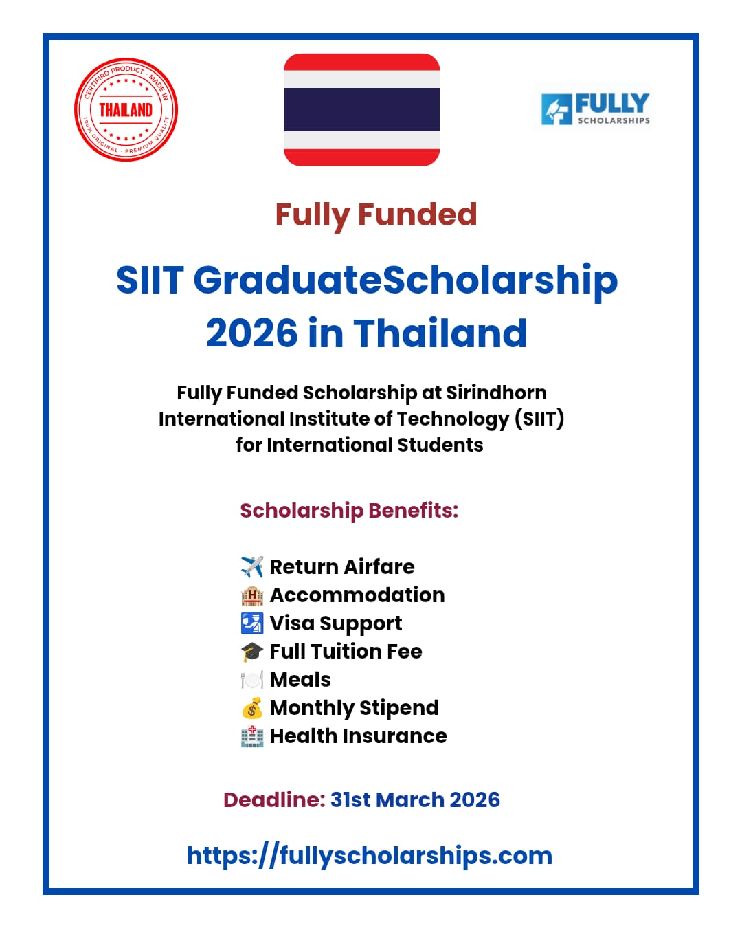 Thursday, March 19, 2026๐น๐ญ SIIT Graduate Scholarship 2026 in Thailand | Fully Funded