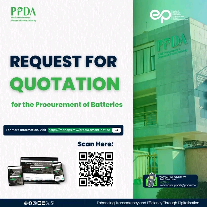 Wednesday, March 18, 2026The Public Procurement & Disposal of Assets Authority (PPDA) has issued a Request for Quotation for motor vehicle batteries on the Malawi National Electronic Procurement System (MANePS).