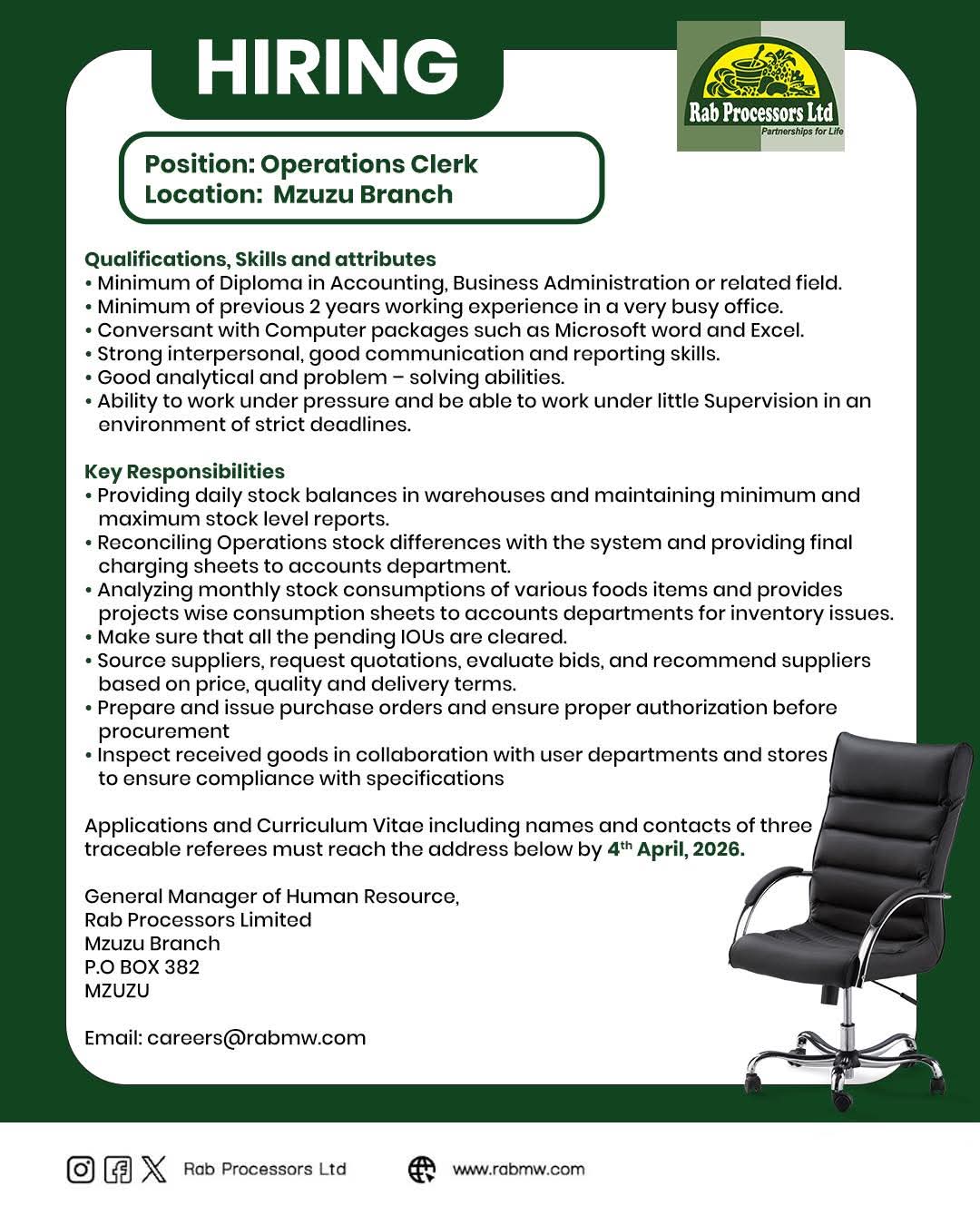 Rab Processors Ltd is looking for a detail-oriented and organized individual to join our team as an Operations Clerk in Mzuzu Branch.