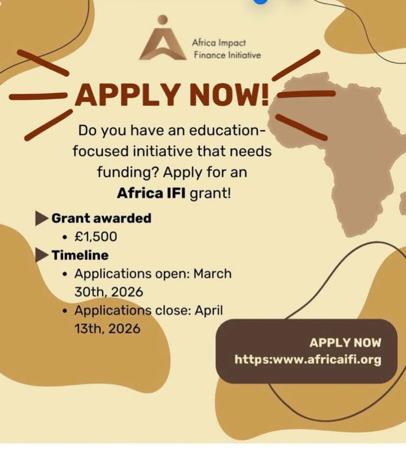 Tuesday, March 31, 2026Is your organisation making a real difference in your community? This is your moment. If you are: ✔️ Based in Africa ✔️ Focused on supporting education for children and young people (up to 25 years) ✔️ Actively operating for at least 12 months …then you’re eligible to apply for the Africa IFI Grant! ✨ 💰 Funding available: £1,500 Take the next step and submit your application today: 🌐 africaifi.org/grant → click “Apply Now” ⏳ Deadline: 13 April 2026 Successful applicants will be announced shortly after the review process 🥳