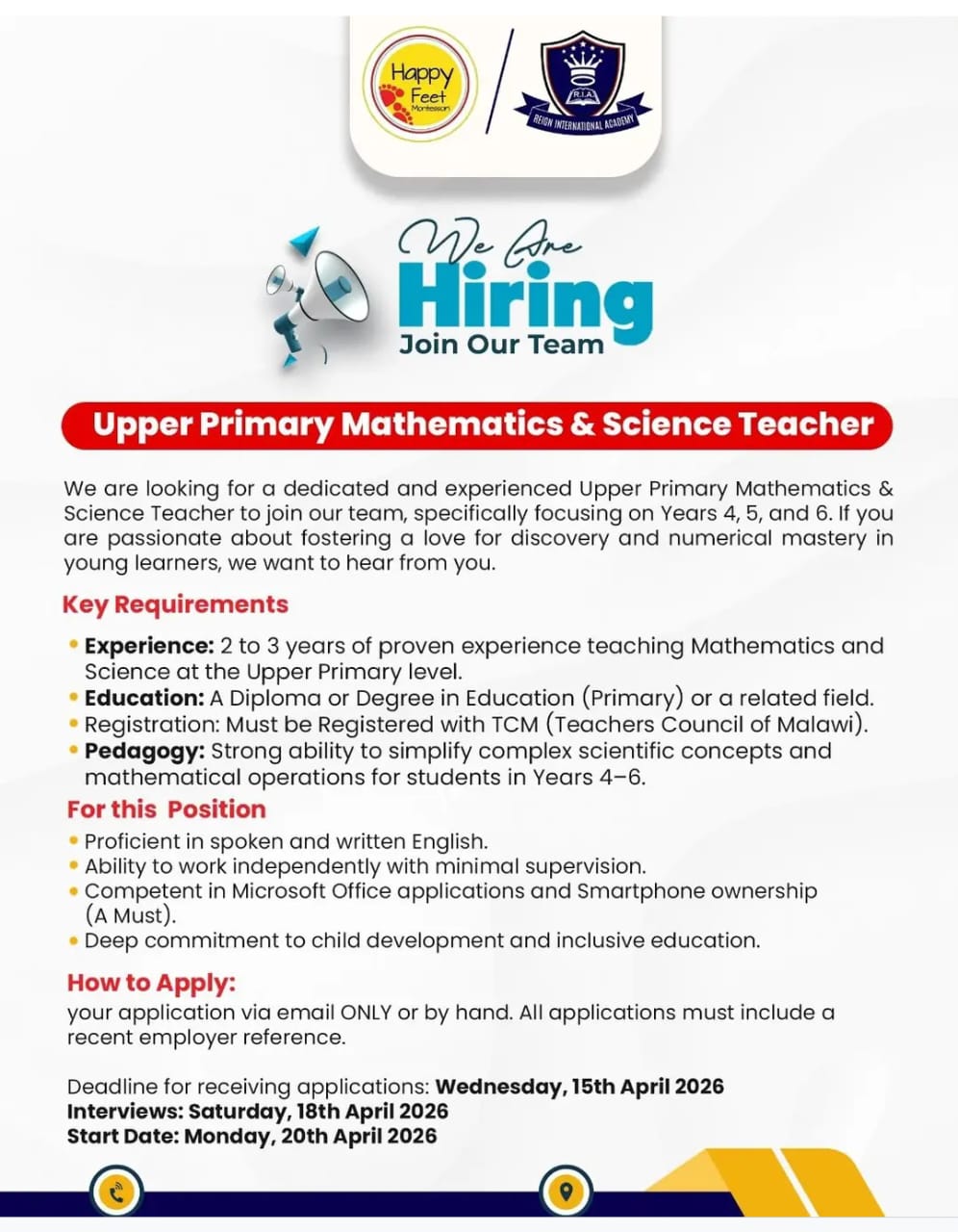 Friday, April 3, 2026POSITION: UPPER PRIMARY MATHEMATICS & SCIENCE TEACHER