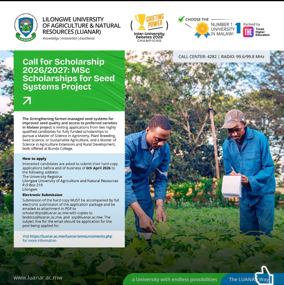 Monday, March 30, 2026The Strengthening Farmer-Managed Seed Systems project is offering 2 fully funded MSc scholarships at Bunda College (LUANAR). đ Programs Agronomy | Plant Breeding | Seed Science | Sustainable Agriculture Agriculture Extension & Rural Development đ How to Apply đ Deadline: 6 April 2026 (end of business) đŹ Hard copy to: The University Registrar LUANAR P.O. Box 219, Lilongwe đ§ Email (PDF required): scholarships@luanar.ac.mw đ CC: bnddcss@luanar.ac.mw, ssp@luanar.ac.mw đ Subject: Application for the program applied
