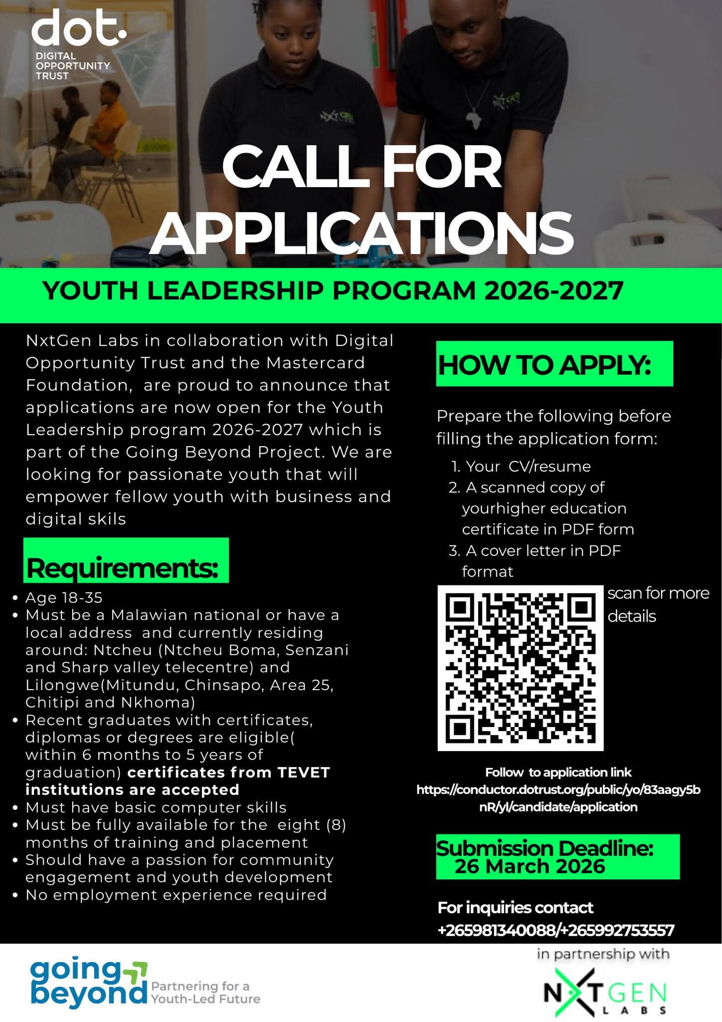 Friday, March 13, 2026NxtGen Labs, working in partnership with Digital Opportunity Trust and the Mastercard Foundation, is inviting applications for the Youth Leadership Program under the Going Beyond Project. The program is open to young people aged 18–35 who are passionate about helping other youth grow in entrepreneurship and are ready to take part in an 8-month leadership development journey. 📍 Eligible locations Lilongwe: Mitundu, Chinsapo, Area 25 (Ngwangwa), Airwing (Chitipi NRC), and Area 23 (Nkhoma) Ntcheu District: Sharp Valley Telecentre, Senzani, and Ntcheu Boma What participants will gain • Training in digital and leadership skills • Mentorship and career development support • Practical experience training and guiding young entrepreneurs Young women and persons with disabilities are highly encouraged to apply.
