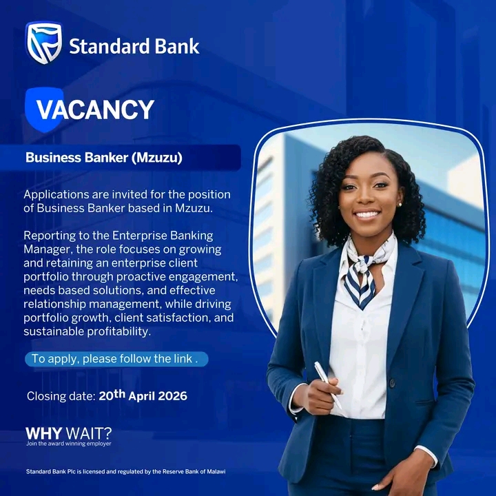 Standard Bank invites applications for a Business Banker in Mzuzu. Grow enterprise client portfolio through proactive engagement and relationship management, driving portfolio growth and client satisfaction. Reporting to the Enterprise Banking Manager.