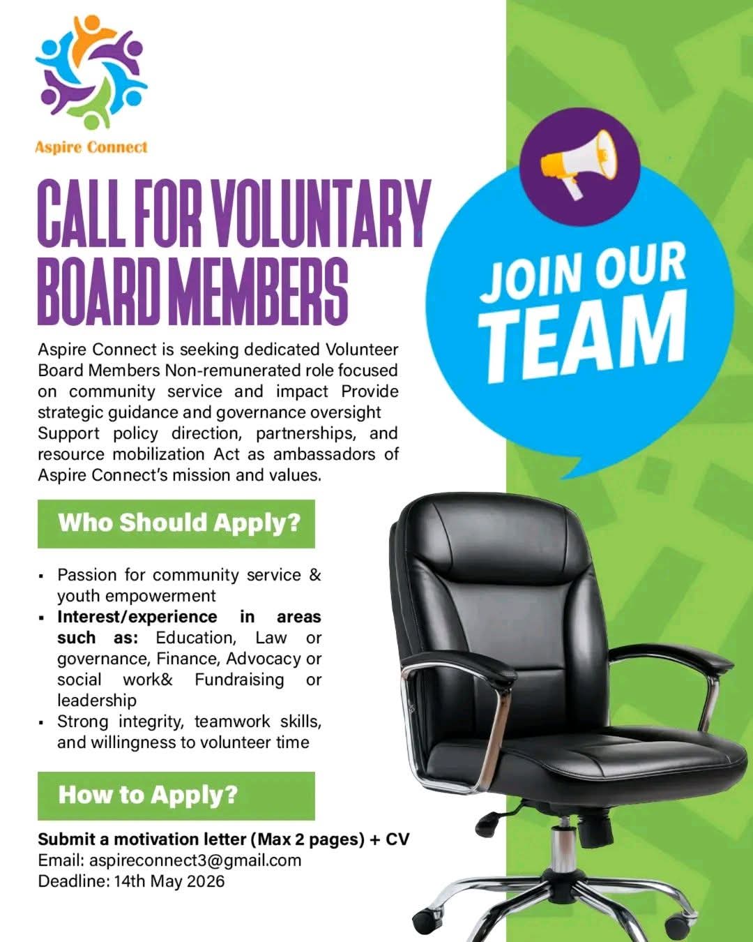 Aspire Connect is inviting applications from passionate and driven individuals to join its Board of Directors and contribute to advancing youth empowerment and community impact. ๐ Opportunity Overview This is a voluntary leadership role focused on providing strategic direction, strengthening governance, and supporting the organizationโs long-term growth. ๐ฏ Who They Are Looking For Individuals with experience or interest in: Education Law Finance Advocacy Leadership and governance ๐ก Role Expectations Provide strategic guidance and oversight Support organizational growth and sustainability Contribute to decision-making at board level Promote the mission and vision of the organization ๐ Who Should Apply Passionate about community impact and youth empowerment Strong leadership and decision-making skills Committed to voluntary service ๐ฉ How to Apply Send your CV and motivation letter to: โ aspireconnect3@gmail.com ๐ Deadline ๐ 14 May 2026 ๐ This is a great opportunity to step into leadership, influence change, and contribute to meaningful impact at a strategic level.