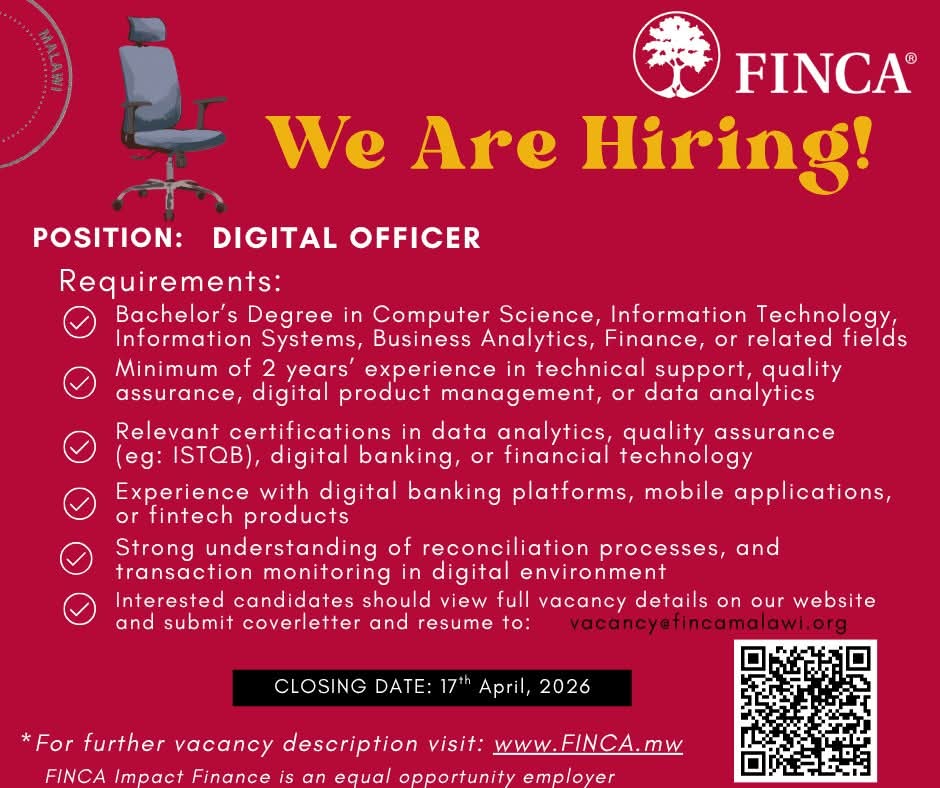 Digital Officer Department: Channels Location: Head Office- Blantyre Validity period: 07/04/2026 – 17/04/2026 About the Business FINCA Limited (Malawi), a subsidiary of FINCA Impact Finance (FIF), is a deposit taking micro finance institution in Malawi operating through 22 (twenty-two) service outlets serving borrowers and savers in rural, urban, and peri-urban areas in Malawi. FINCA Limited (Malawi) is increasing access to its services and products through alternate channels. About the Role Role Purpose: The Digital Officer is responsible for ensuring the technical integrity, optimal performance, and continuous improvement of FINCA’s digital products and platforms. This role provides dedicated oversight of technical operations, including testing, quality assurance, daily reconciliation management, and real-time system monitoring. The officer leverages technical expertise and data analytics to enhance customer engagement, drive product adoption, and identify opportunities for cross-selling and personalization. By conducting real-time analytics and monitoring transaction patterns, the Digital Officer plays a crucial role in detecting customer behavior trends and supporting data-driven decision-making to improve overall digital service delivery. Key Responsibilities: • Leading technical testing and quality assurance processes to ensure digital products meet performance and functionality standards. • Managing and executing daily reconciliation activities to ensure accuracy and integrity of digital transactions. • Monitoring system performance continuously to identify and resolve technical issues proactively. • Defining technical requirements for digital products and platforms in collaboration with stakeholders. • Conducting real-time analytics to personalize products, communications, and customer experiences. • Developing and implementing cross-selling strategies based on customer data insights and transaction patterns. • Driving customer engagement through smart loyalty programs and innovative money management solutions. • Interpreting individual transaction patterns to detect income fluctuations and understand customer spending behavior. • Identifying early signs of customer disengagement and implementing retention strategies. • Providing technical support and troubleshooting for digital platforms and products. Tasks: • Develop and execute comprehensive test plans for all digital products and platform updates. • Perform daily reconciliation of digital transactions across all platforms and channels. • Monitor system performance metrics, uptime, and error logs to ensure optimal functionality. • Document and report technical issues, bugs, and system anomalies to relevant stakeholders. • Collaborate with development teams to define technical specifications and requirements for new features. • Analyze customer data and transaction patterns using analytics tools to generate actionable insights. • Create detailed reports on customer behavior, product usage, and engagement metrics. • Design and propose cross-selling campaigns based on customer segmentation and behavior analysis. • Develop and maintain dashboards for real-time monitoring of key performance indicators. • Implement customer retention strategies by identifying at-risk customers through data analysis. • Support the design and implementation of loyalty programs and personalized product offerings. • Maintain accurate documentation of technical processes, procedures, and system configurations. • Coordinate with third-party vendors and technical support teams to resolve platform issues. • Ensure compliance with data security and privacy regulations in all digital operations. • Stay updated on digital banking trends, financial technology innovations, and best practices in customer analytics. Qualification: • A Bachelor’s degree in Computer Science, Information Technology, Information Systems, Business Analytics, Finance, or any related field is required. • Relevant certifications in data analytics, quality assurance (e.g., ISTQB), digital banking, or financial technology would be advantageous. Experience: • A minimum of 2 years of experience in technical support, quality assurance, digital product management, or data analytics, preferably within the financial services or microfinance sector. • Experience with digital banking platforms, mobile applications, or fintech products. • Strong understanding of reconciliation processes and transaction monitoring in digital environments. Knowledge and Skills: • Proven experience in testing, quality assurance, and technical troubleshooting of digital products. • Strong analytical skills with the ability to interpret data, identify trends, and generate insights from customer behavior and transaction patterns. • Proficiency in data analytics and visualization tools (e.g., Power BI, Tableau, Google Analytics, Excel Advanced Functions). • Knowledge of SQL or other database query languages for data extraction and analysis. • Familiarity with testing methodologies and tools (e.g., manual testing, automated testing, test case management). • Understanding of digital banking systems, APIs, and integration processes. • Strong attention to detail and accuracy, particularly in reconciliation and quality assurance activities. • Excellent problem-solving skills with the ability to diagnose and resolve technical issues efficiently. • Ability to work collaboratively with cross-functional teams including product, development, and business units. • Knowledge of customer engagement strategies, loyalty programs, and cross-selling techniques in financial services. • Strong communication skills with the ability to present technical information clearly to non-technical stakeholders. • Working knowledge of Power BI or similar business intelligence tools. • Understanding data security, privacy regulations, and compliance requirements 