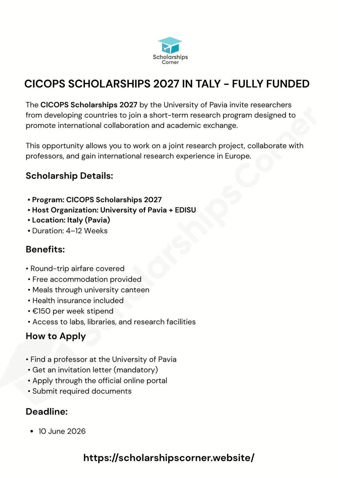 Saturday, April 18, 2026CICOPS Scholarships 2027 at the University of Pavia are now open for applications. This is a fully funded research program designed for international scholars to collaborate with academic experts in Italy. What you get Round-trip airfare Free accommodation Meal support (university canteen access) Health insurance coverage ā¬150 weekly allowance Access to university research facilities (labs, libraries, etc.) Important requirement Applicants must secure an invitation letter from a University of Pavia professor before applying. Without it, applications will not be considered. Deadline 10 June 2026