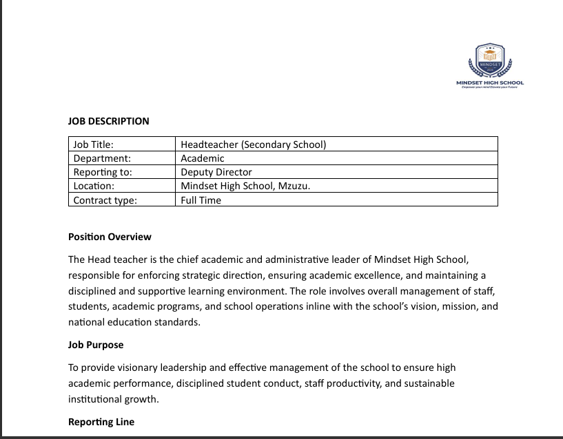 The Head teacher is the chief academic and administrative leader of Mindset High School, responsible for enforcing strategic direction, ensuring academic excellence, and maintaining a disciplined and supportive learning environment. The role involves overall management of staff, students, academic programs, and school operations inline with the school’s vision, mission, and national education standards.