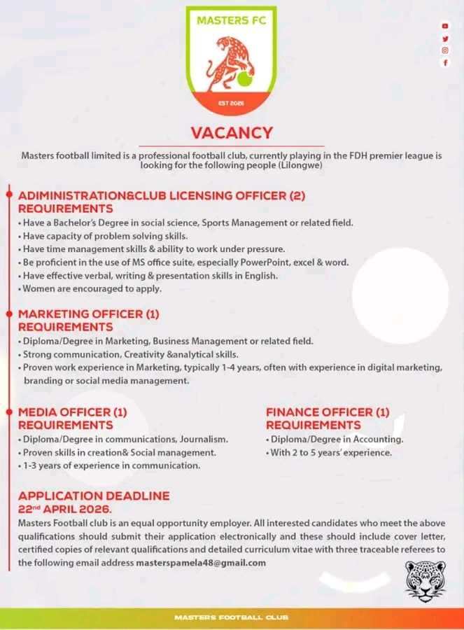 Masters Football Club (Masters FC), a professional team competing in the FDH Premier League, is inviting applications from qualified and passionate individuals to join our team in Lilongwe