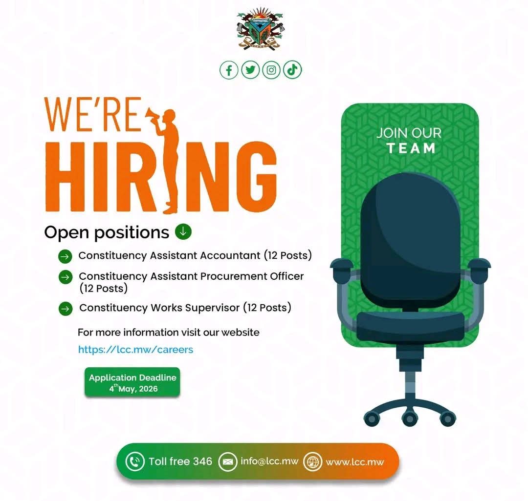 Monday, April 27, 2026Lilongwe City Council is inviting applications from qualified candidates to fill multiple positions under its constituency development structures. š Available Positions Constituency Assistant Accountant (12 Posts) Constituency Assistant Procurement Officer (12 Posts) Constituency Works Supervisor (12 Posts) š Opportunity Overview These roles offer a chance to contribute to community development and service delivery while gaining valuable public sector experience. šÆ Who Should Apply Candidates with relevant qualifications and experience in: Accounting / Finance Procurement / Supply Chain Construction / Works supervision Individuals ready to work at constituency level and support development projects š Application š Visit and apply through the official portal: Link