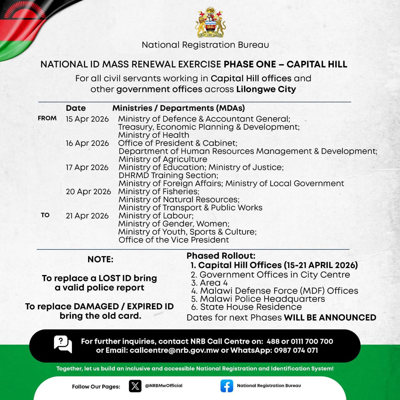 Tuesday, April 14, 2026This notice from the National Registration Bureau (NRB) announces the first phase of a mass renewal exercise for National IDs, specifically targeting civil servants in Lilongwe.Overview of Phase OneTarget Audience: Civil servants working at Capital Hill and other government offices across Lilongwe City.Duration: April 15, 2026 – April 21, 2026.Location: Capital Hill Offices.Schedule by Ministry/DepartmentThe renewal dates are organized by specific Ministries, Departments, and Agencies (MDAs):DateMinistries / Departments15 Apr 2026Defence, Accountant General, Treasury, Economic Planning & Development, Health.16 Apr 2026Office of President & Cabinet (OPC), DHRMD, Agriculture.17 Apr 2026Education, Justice, DHRMD Training Section, Foreign Affairs, Local Government.20 Apr 2026Fisheries, Natural Resources, Transport & Public Works.21 Apr 2026Labour, Gender & Women, Youth & Culture, Office of the Vice President.Requirements for ReplacementLost ID: You must bring a valid police report.Damaged/Expired ID: You must bring the old ID card.Future PhasesWhile Phase 1 focuses on Capital Hill, the NRB has identified the next locations for the phased rollout (dates to be announced):Government Offices in City CentreArea 4Malawi Defense Force (MDF) OfficesMalawi Police HeadquartersState House ResidenceContact Information: For inquiries, the NRB can be reached via their Call Centre at 488 or 0111 700 700, WhatsApp at 0987 074 071, or email at callcentre@nrb.gov.mw.