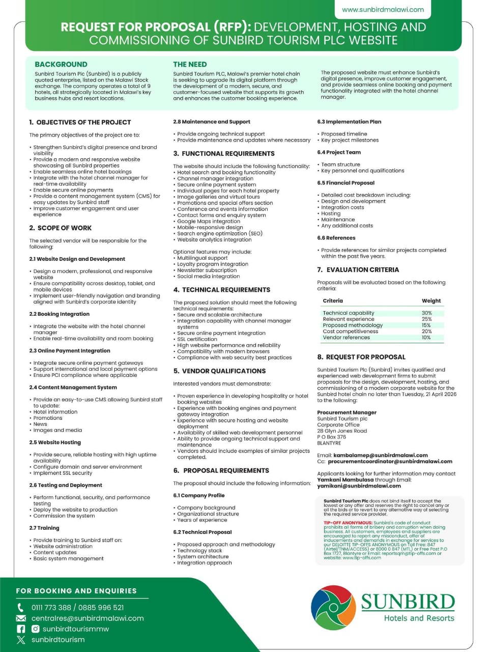 Deadline: 21 April 2026. Proposals: Email kambalamep@sunbirdmalawi.com. Enquiries: Contact Yamkani Mambulasa at yamikani@sunbirdmalawi.com.