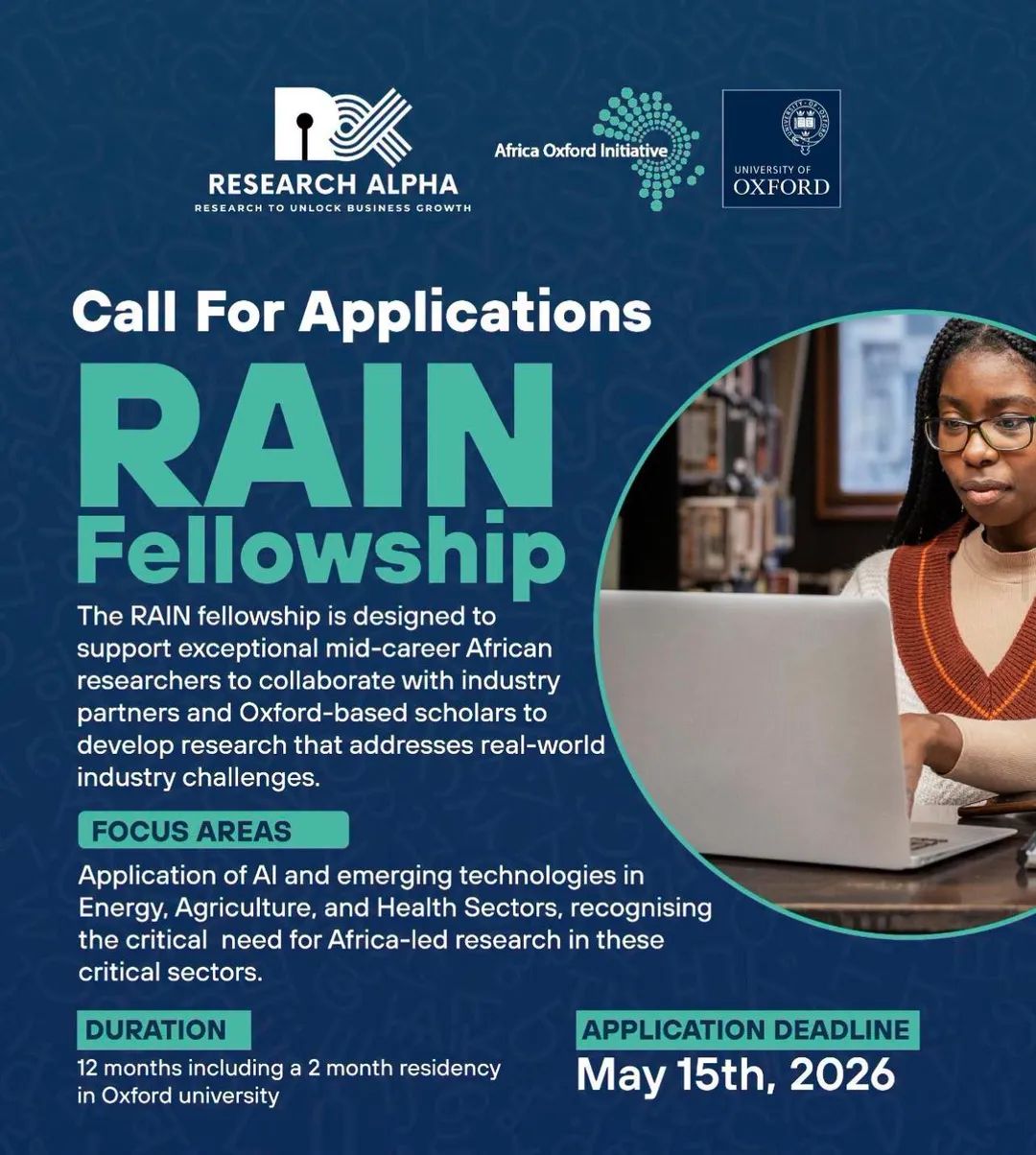 Monday, April 20, 2026The Rain Fellowship, in collaboration with the Africa Oxford Initiative, is now open for applications. This program targets outstanding mid-career African researchers interested in applying AI and emerging technologies to solve practical challenges in key sectors such as Energy, Agriculture, and Health. š What the fellowship offers: A 12-month research program Collaboration with Oxford-based scholars and industry partners A 2-month in-person residency in Oxford Opportunity to align research with real industry needs š„ Who should apply: Mid-career researchers based at African universities or research institutions Individuals working on AI or emerging technologies with real-world applications š Important requirement: Applicants must identify: A potential collaborator at Oxford University A research topic relevant to industry before applying š Apply here: Link š§ For inquiries: client@researchalpha.ai Feel free to share this opportunity with anyone who may benefit.