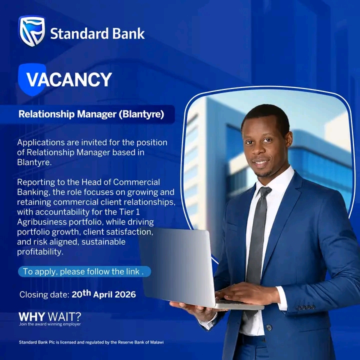 Standard Bank is seeking a Relationship Manager based in Blantyre. The role focuses on growing and retaining commercial client relationships, driving Tier 1 Agribusiness portfolio growth, client satisfaction, and sustainable profitability.