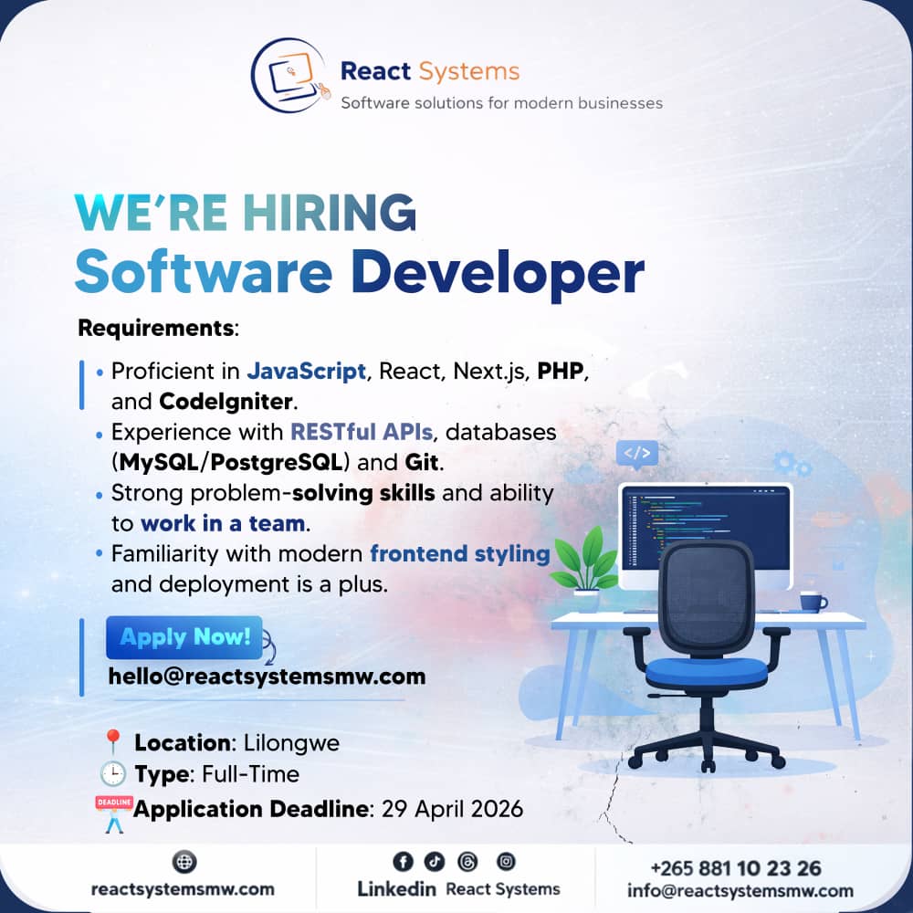 Role Description We are looking for a full-time Software Developer to join our team in Lilongwe. In this role, you will design, develop, and maintain software applications, mainly focusing on back-end development. Your daily tasks will include understanding user needs, writing and testing code, fixing bugs, and working with other team members to build efficient and scalable solutions.