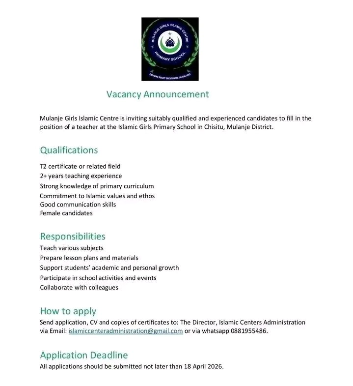 Mulanje Girls Islamic Centre is inviting suitably qualified and experienced candidates to fill in the position of a teacher at the Islamic Girls Primary School in Chisitu, Mulanje District.