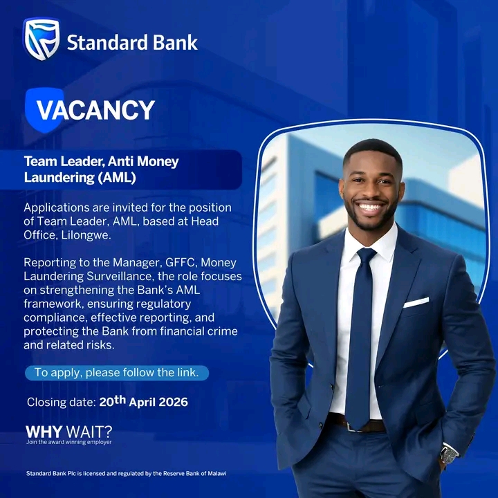 Standard Bank seeks a Team Leader, AML based at Head Office, Lilongwe. Strengthen the Bank's AML framework, ensure regulatory compliance, and protect against financial crime. Reporting to the Manager, GFFC, Money Laundering Surveillance.
