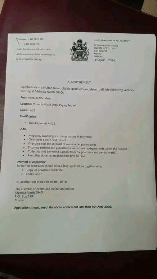Mzimba North District Health Office is inviting applications from suitably qualified candidates to fill the position of Hospital Attendant. ๐ Job Details Position: Hospital Attendant Location: Mzimba North DHO (Paying Section), Mzuzu Grade: N/E ๐ Qualifications Malawi School Certificate of Education (MSCE) ๐งพ Key Responsibilities Cleaning wards (mopping, scrubbing, dusting) Preparing beds for incoming patients Managing waste disposal in designated areas Assisting patients and guardians within hospital departments Collecting and delivering supplies from pharmacy and wards Performing any other assigned duties ๐ฉ How to Apply Submit your application including: Copy of academic certificate National ID Address to: The Director of Health and Sanitation Services Mzimba North DHO P.O. Box 299 Mzuzu ๐ Deadline ๐ 30 April 2026 ๐ Only applications that meet the requirements and deadline will be considered.