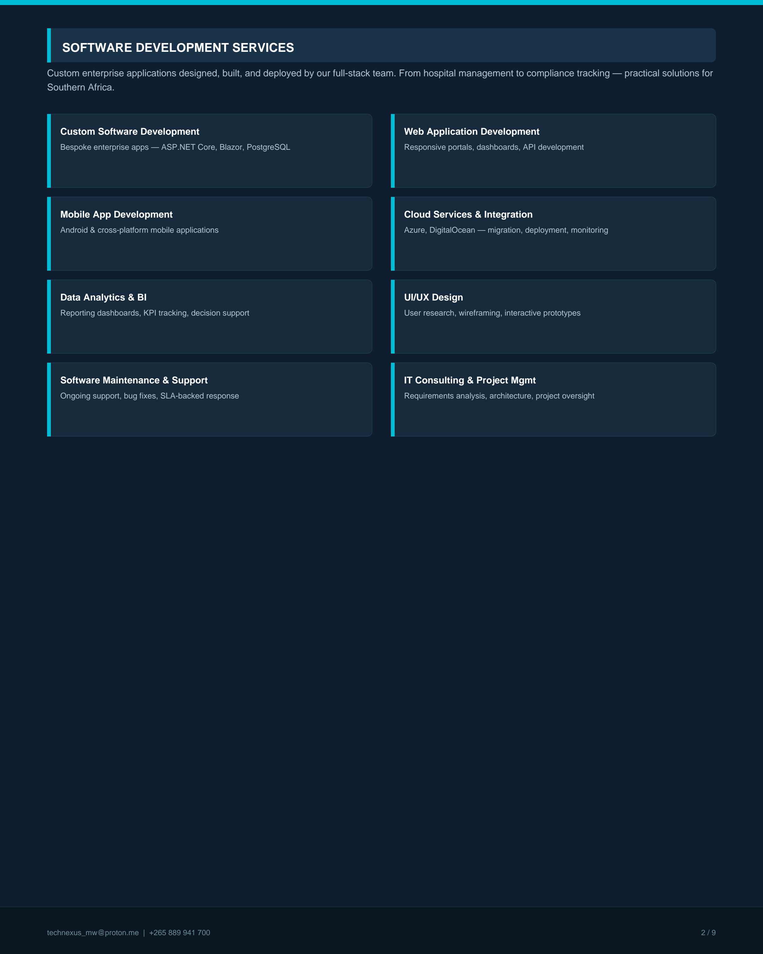 Custom enterprise software for healthcare, government, and business. We build web applications, mobile apps, hospital management systems, compliance platforms, and data analytics dashboards. Full-stack development in ASP.NET Core, Blazor, and PostgreSQL. Cloud deployment on Azure and DigitalOcean. Ongoing maintenance and support available. Web apps from MK 2,850,000. Custom enterprise systems from MK 7,000,000. MANePS registered. Contact us to scope your project.