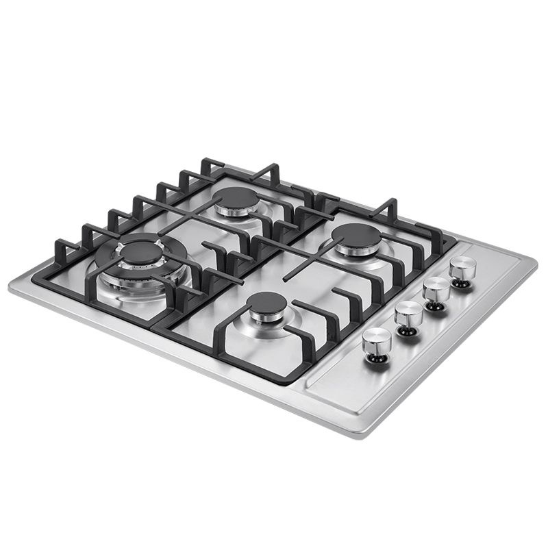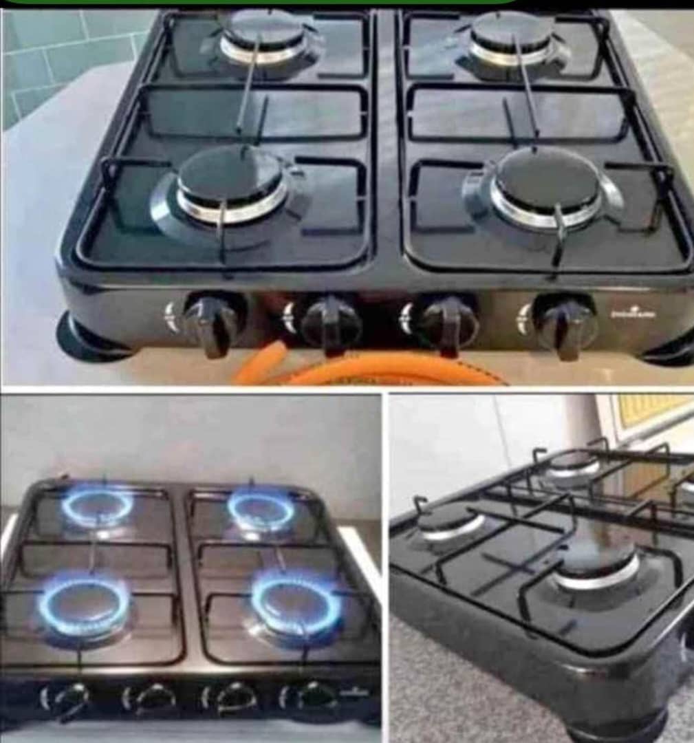 Heavy-duty 4-burner gas stove with a durable black coated surface and sturdy cast iron pan supports. Features manual ignition, adjustable flame control knobs for each burner, and comes with a gas hose included. Compact countertop design perfect for home kitchens, rentals, or backup cooking. Runs on standard LPG gas. Even flame distribution for efficient cooking.